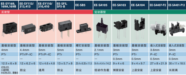 歐姆龍型號EE-SF5,SF5-B反射式光電開關可應用于:小家電、照相機、投幣機、掃描儀、讀卡裝置、游戲機、ATM機、驗鈔、點鈔機、打印機、紙檢裝置、復印機、傳真機、掃描儀、條碼閱讀器、自動售貨機、自動售票機、等一些光電產品。