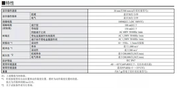 歐姆龍D2AW微動開關的機械壽命和電氣壽命均為至少200,000次(30次/min),符合IEC IP67防護等級,在60%RH以下、無結冰或結露的情況下,能夠在-40℃~+85℃的溫度范圍內工作,而在最高95%RH的環境中,能夠在+5~+35℃的溫度范圍內工作。不僅如此,該開關還具有很強的耐電壓性和耐沖擊性,可適用于工作條件較為嚴苛的環境中。