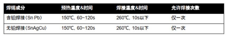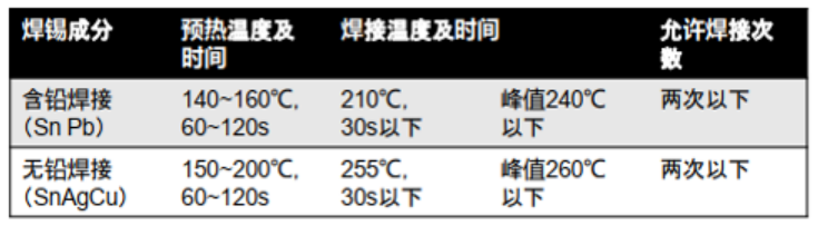手工焊:350攝氏度:3秒內或者260攝氏度:10秒內,注意僅可焊接一次。