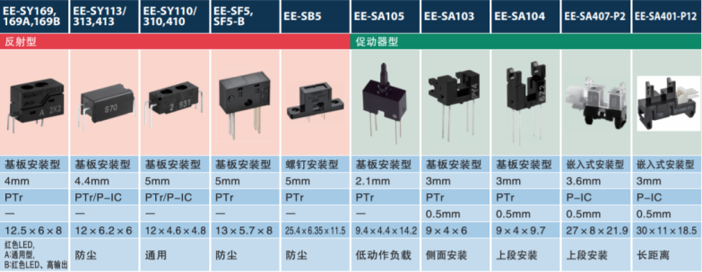 例如在打印機、智能設備、工業機械等設備上可以使用EE-SX1088,EE-SX1041,EE-SF5EE-SX1081,這款小體積槽型和對射式光電開關,驅動功耗低、靈敏度高,輸出電流高低,超小的超寬。