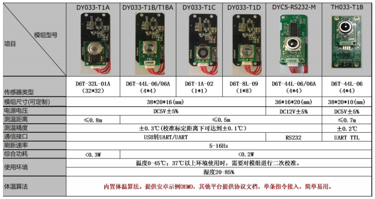 我們同時也可以給您提供一整套的測溫解決方案!實現購買即可使用,無需二次開發!我們可以根據客戶需求,搭載1*11*8, 4*432*32歐姆龍測溫傳感器,實現檢測距離0.5-0.8米測溫,測溫精度可以達到±0.2℃(校準標定距離下可達到±0.1℃)。也可以滿足客戶的多種串口通訊方式(1USBUART/UART;(2) RS232 ;(3) UART TTL。模塊資料如下: