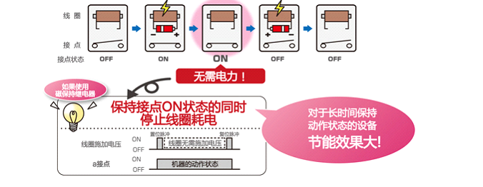 磁保持繼電器是近幾年發(fā)展起來的一種新型繼電器,也是一種自動開關。和其他電磁繼電器一樣,對電路起著自動接通和切斷作用。所不同的是,磁保持繼電器的常閉或常開狀態(tài)完全是依賴永久磁鋼的作用,其開關狀態(tài)的轉(zhuǎn)換是靠一定寬度的脈沖電信號觸發(fā)而完成的.線圈通電時,接點處于on或者off狀態(tài),即使切斷線圈電壓仍能保持該狀態(tài)的功能。在設備的動作狀態(tài)下,停止線圈耗電,實現(xiàn)節(jié)能。這一類的繼電器,叫做磁保持繼電器;