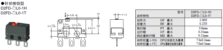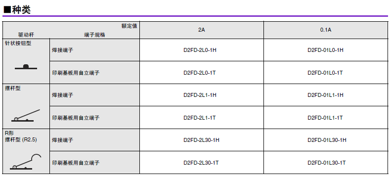 D2FD-2 超級小型基本開關(guān) 兼具防塵功能的極超小型基本開關(guān) 利用橡膠封裝的密封結(jié)構(gòu)實(shí)現(xiàn)防塵 (IEC IP6X)??稍谟谢覊m、紙粉的環(huán)境下使用。 可動(dòng)片為1片彈簧構(gòu)造,支持AC125V 2A開關(guān),更有微小負(fù)載型可供選擇。 還備有焊接、印刷基板用端子。