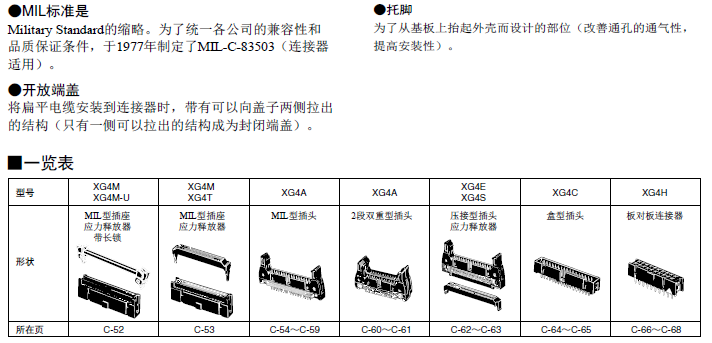 印刷基板連接器的核心、MIL規格標準品 通過采用新型生產力設計,高可靠性與低價格的同步實現。 備有便于省空間封裝的盒型插頭(XG4C)。 同時具有可進行中繼使用的壓接型插頭(XG4E)。 將本公司的散線壓接型連接器(XG5)特有插頭(XG8)與PCB型(XG2)組合使用可實現種類豐富的各種封裝。 適用本公司自己開發的簡易鎖定擺桿可以使特有插頭(XG8)和盒型插頭(XG4C)也能夠進行鎖定。 MIL規格(MIL-C-83503)標準。 標準品符合UL規格(File No. E103202)認證產品。