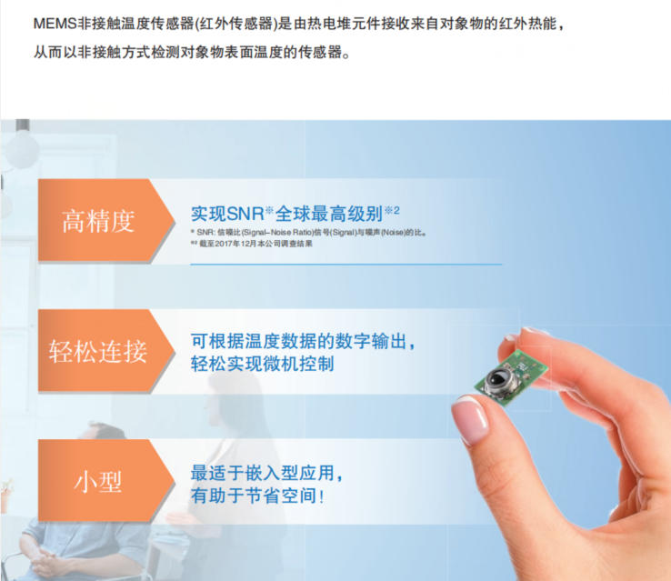 對靜止人物也能檢測高靈敏度的人體感應傳感器 通過使用自制的MEMS、ASIC,達到了高水平的SNR。(D6T-32L-01A除外) 數字輸出,抗干擾性優異。 通過低串擾的視野特性,實現更高精度的區域溫度檢測。